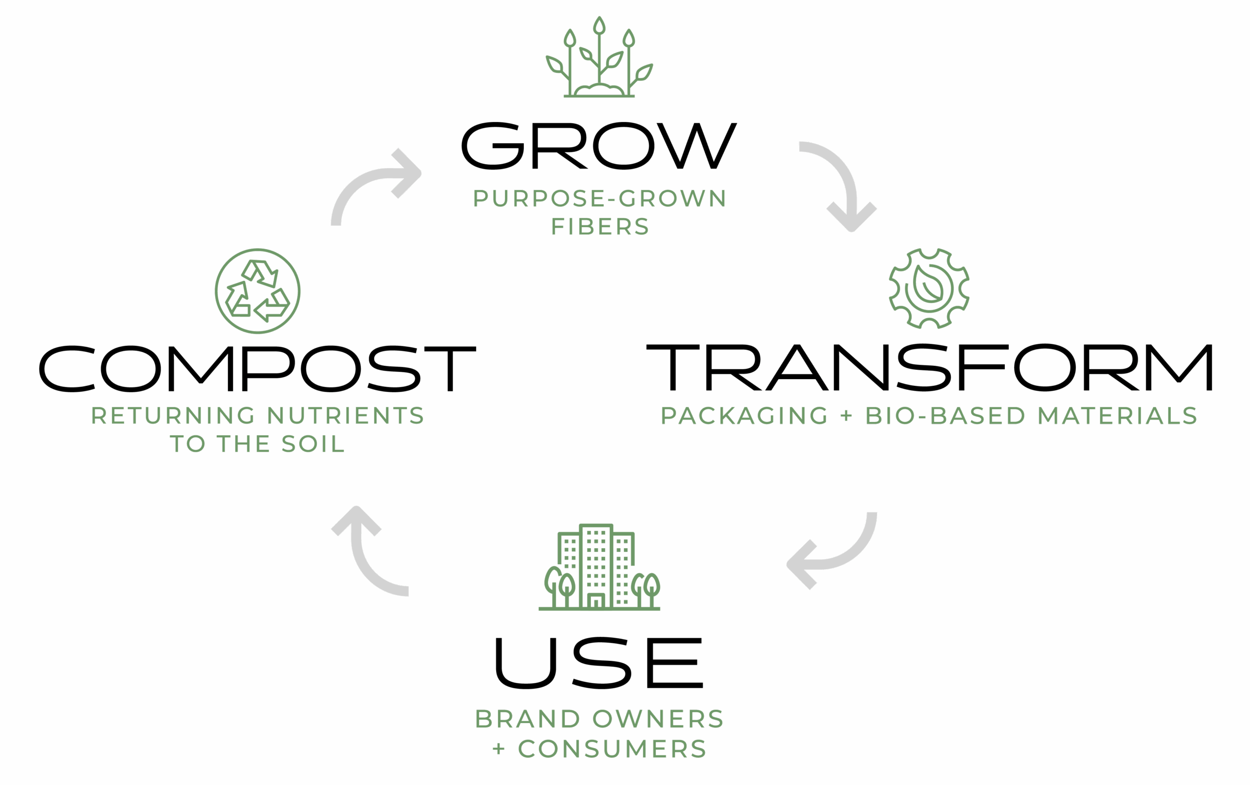 We grow carbon-negative grasses which are transformed into useful products; after use, they are designed to return to the earth as nutrient-rich compost . . . where the cycle of growth begins again.